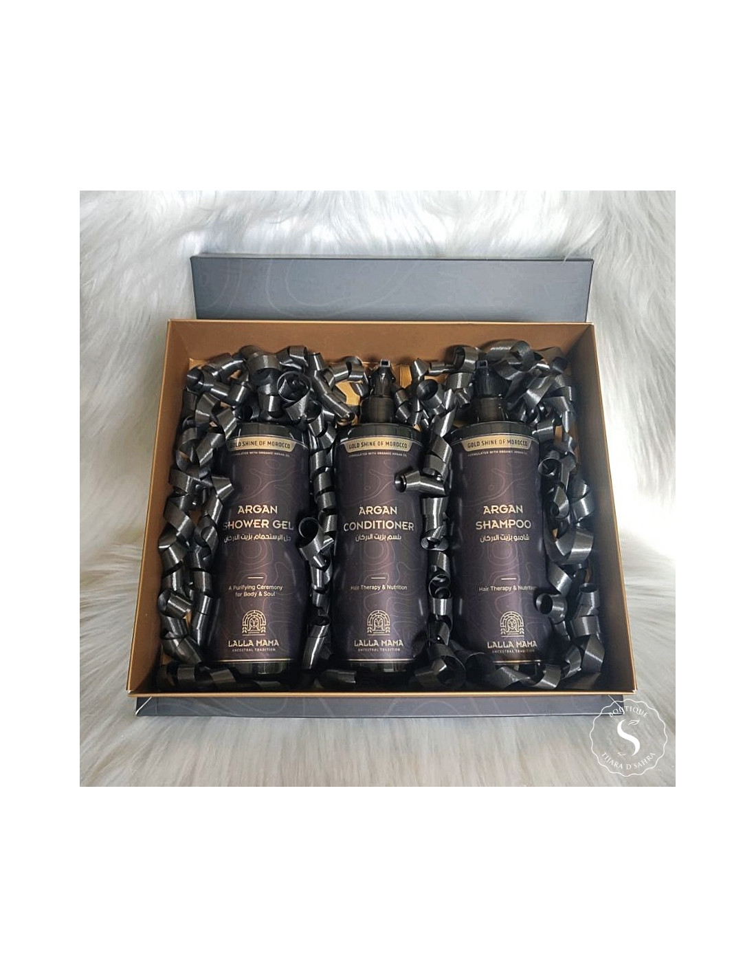 Coffret à l’huile d’argan – Gold Shine of Morocco (Shampooing + Après-shampooing + Gel douche) – 3×400 ml
